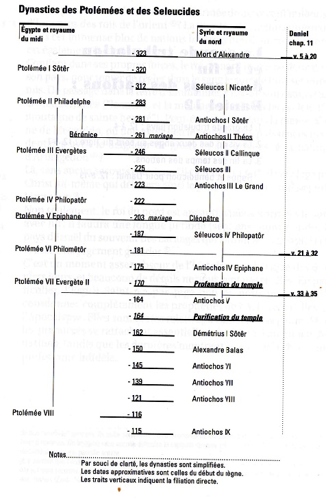 Le royaume grec d’Alexandre a été déchiré en quatre parties après sa mort. Parmi ses quatre successeurs, deux dynasties (les Séleucides au nord et les Ptolémées au midi) jouent un rôle majeur dans l’histoire d’Israël. Un chef apparaît, Antiochus, sous le symbole d’une autre petite corne (surgie de l’orient). Il préfigure le chef futur de l’Assyrie, le roi du nord, le dernier ennemi d’Israël et de Christ.